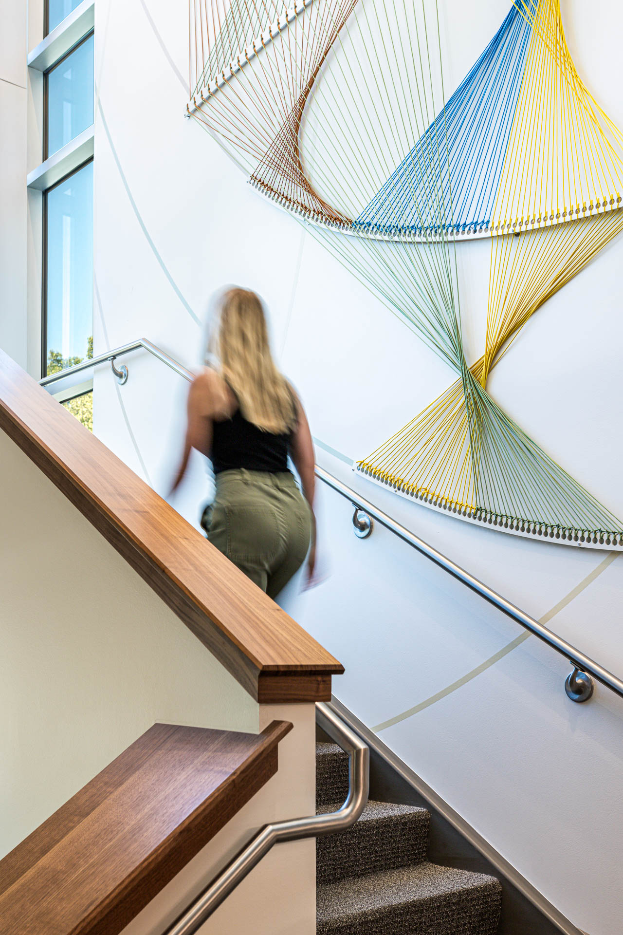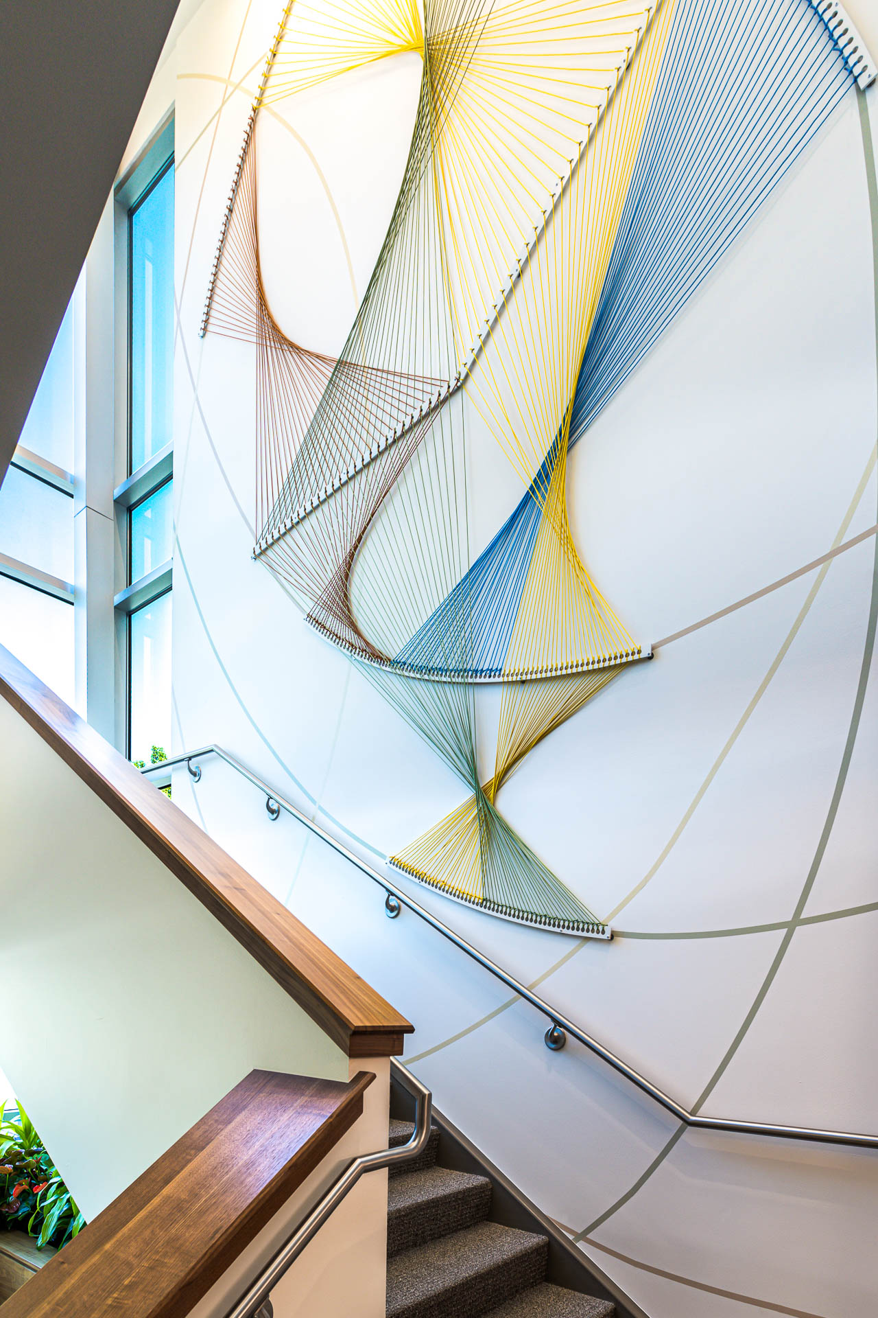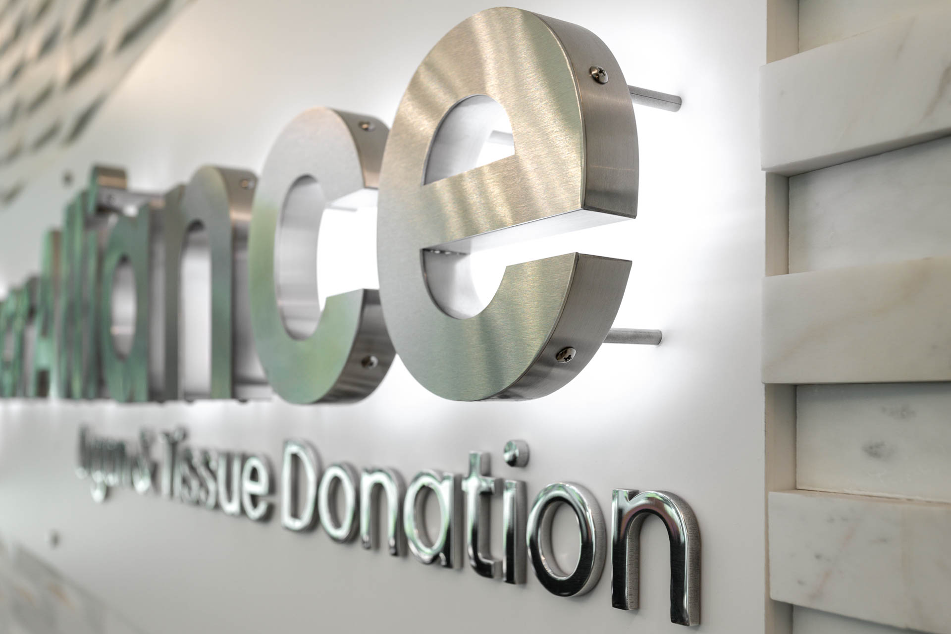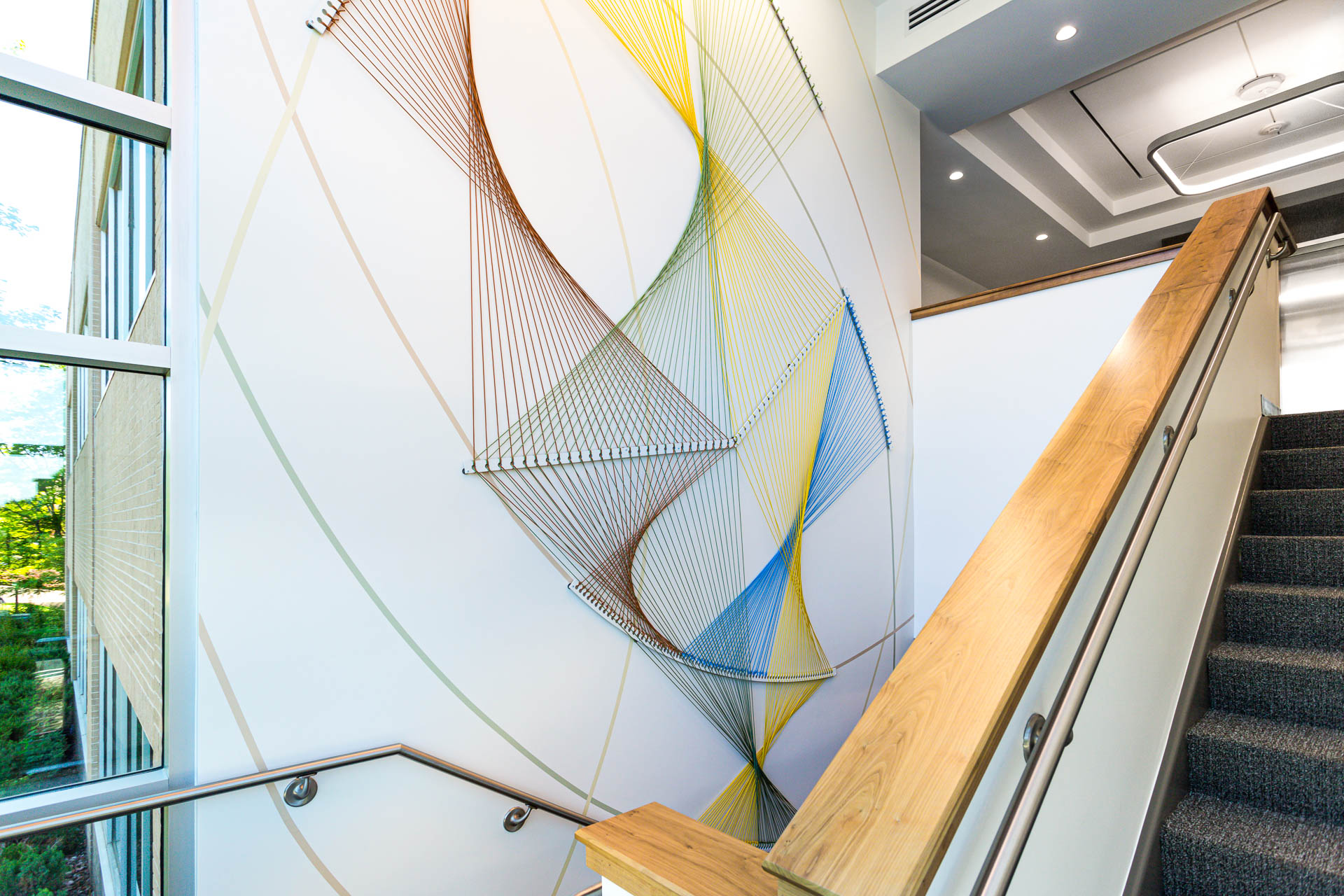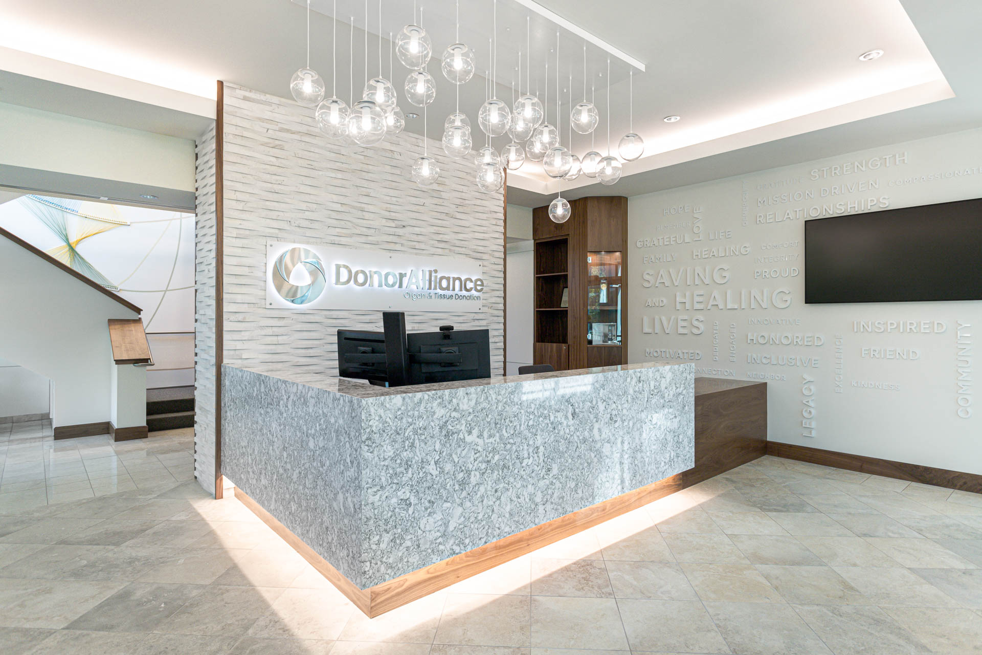 The final design features illuminated rings and reflective materials that symbolize the endless connections created through organ and tissue donation. At its center, vibrant paracord elements, woven in Donor Alliance’s signature colors, capture movement and energy, shining like a beacon of hope visible even at night. Through close collaboration and multiple design iterations, the stairwell and lobby installations were crafted to feel joyful and uplifting, turning brand storytelling into an emotional, experiential moment that honors both donors and recipients alike.