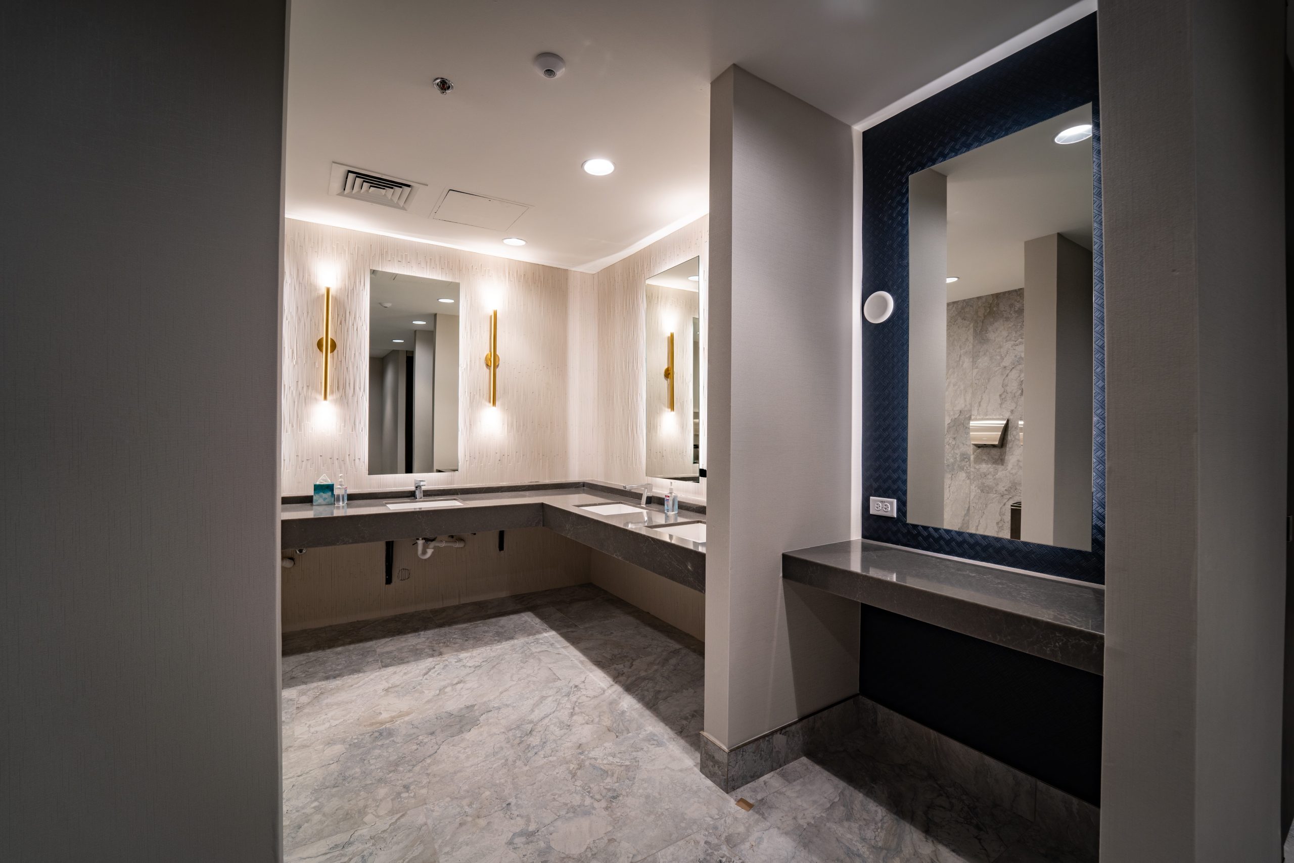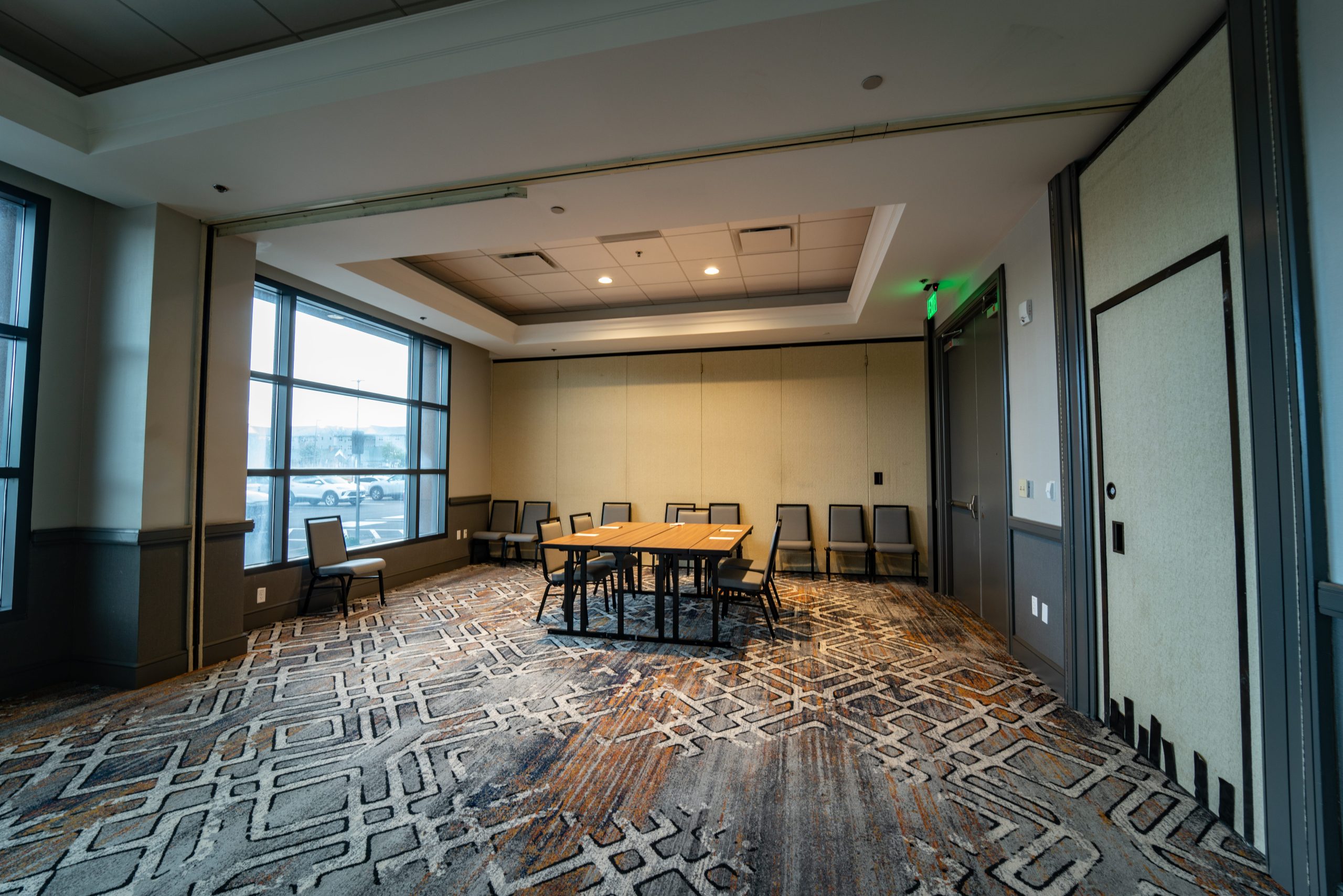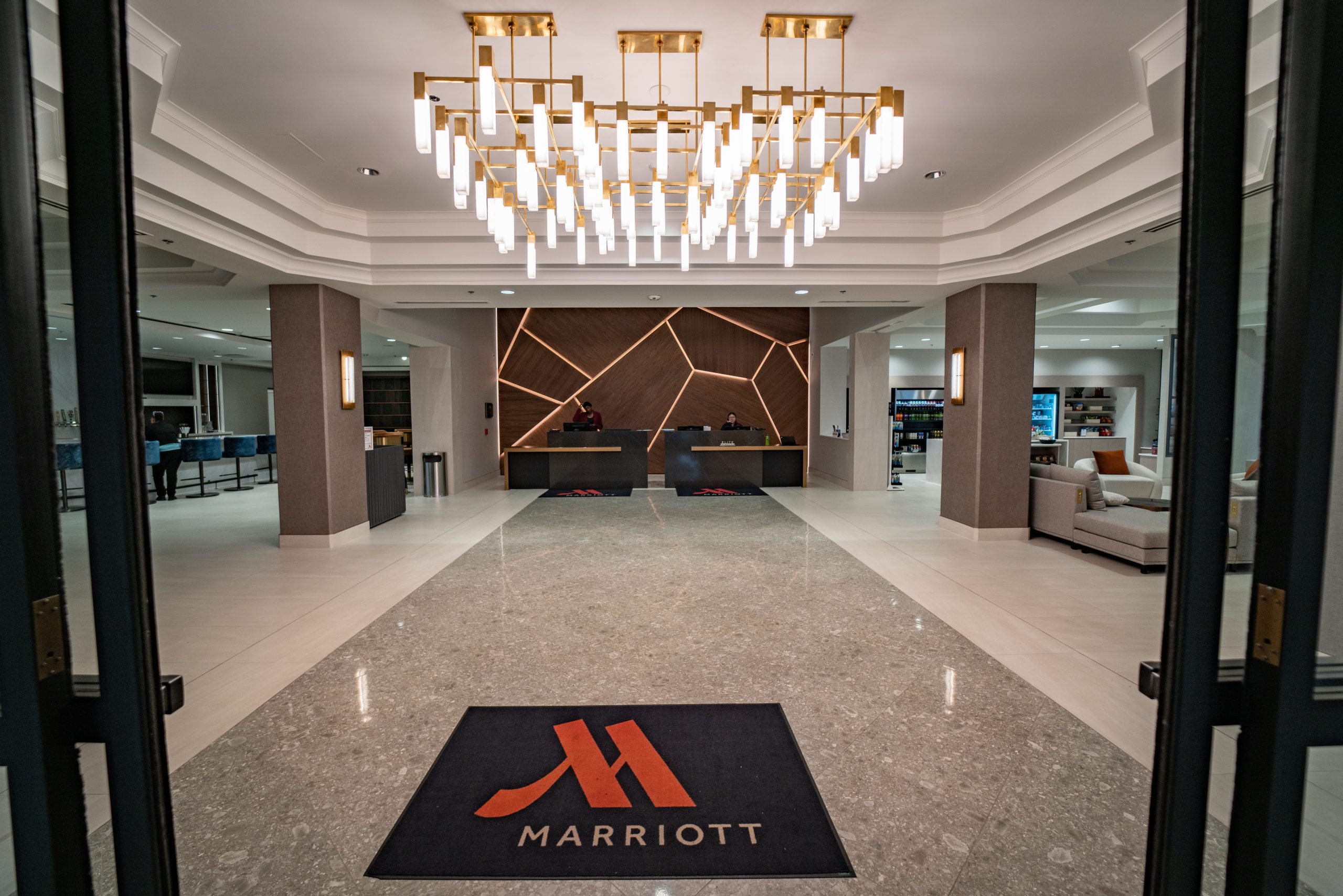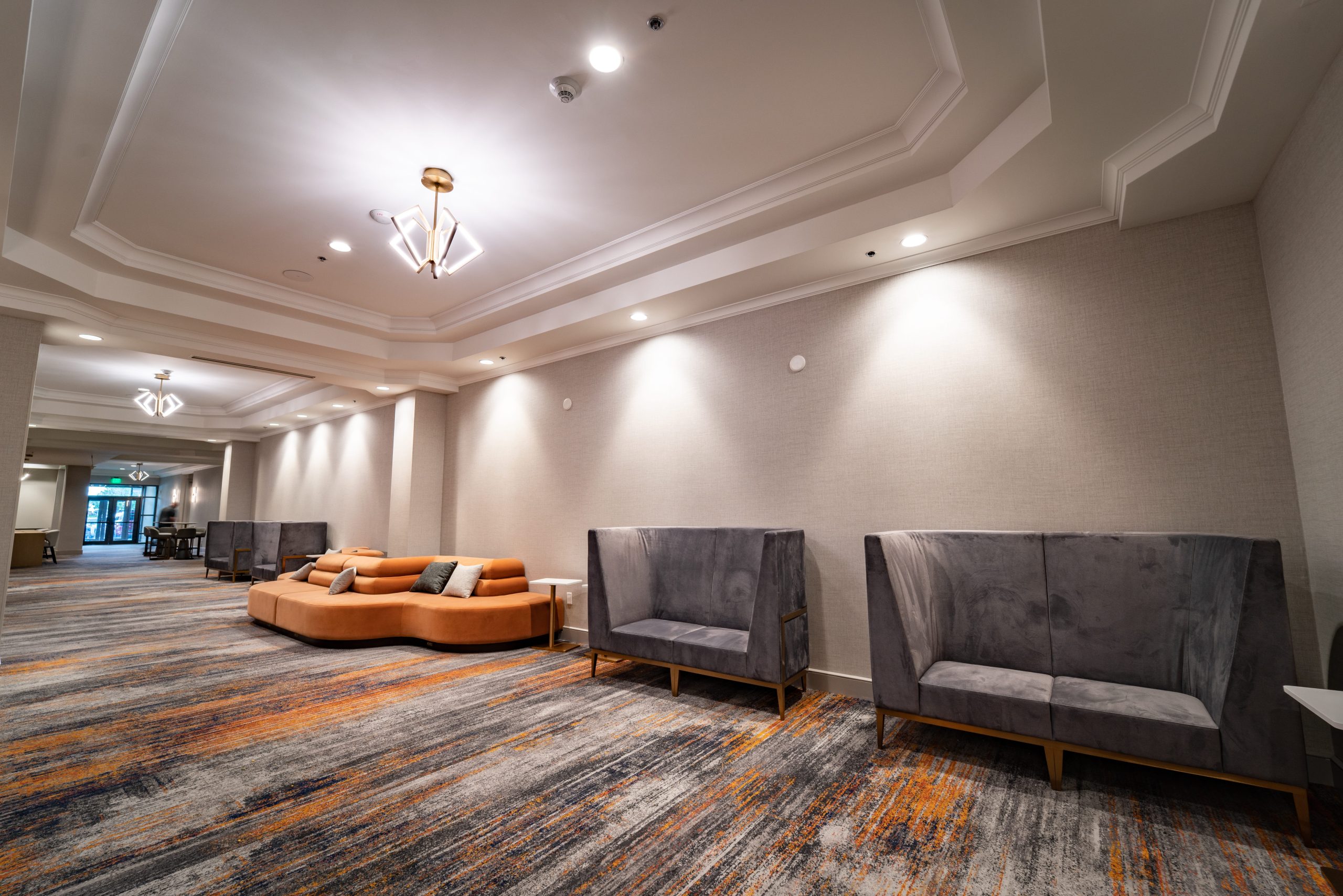 The flooring scope included the installation of carpet and tile systems throughout high-traffic and public-facing areas, including the hotel entrance, lobby, meeting and event spaces, fitness center, and lobby Starbucks. Each space required a tailored approach to meet both aesthetic and performance requirements associated with a modern, full-service Marriott property.
