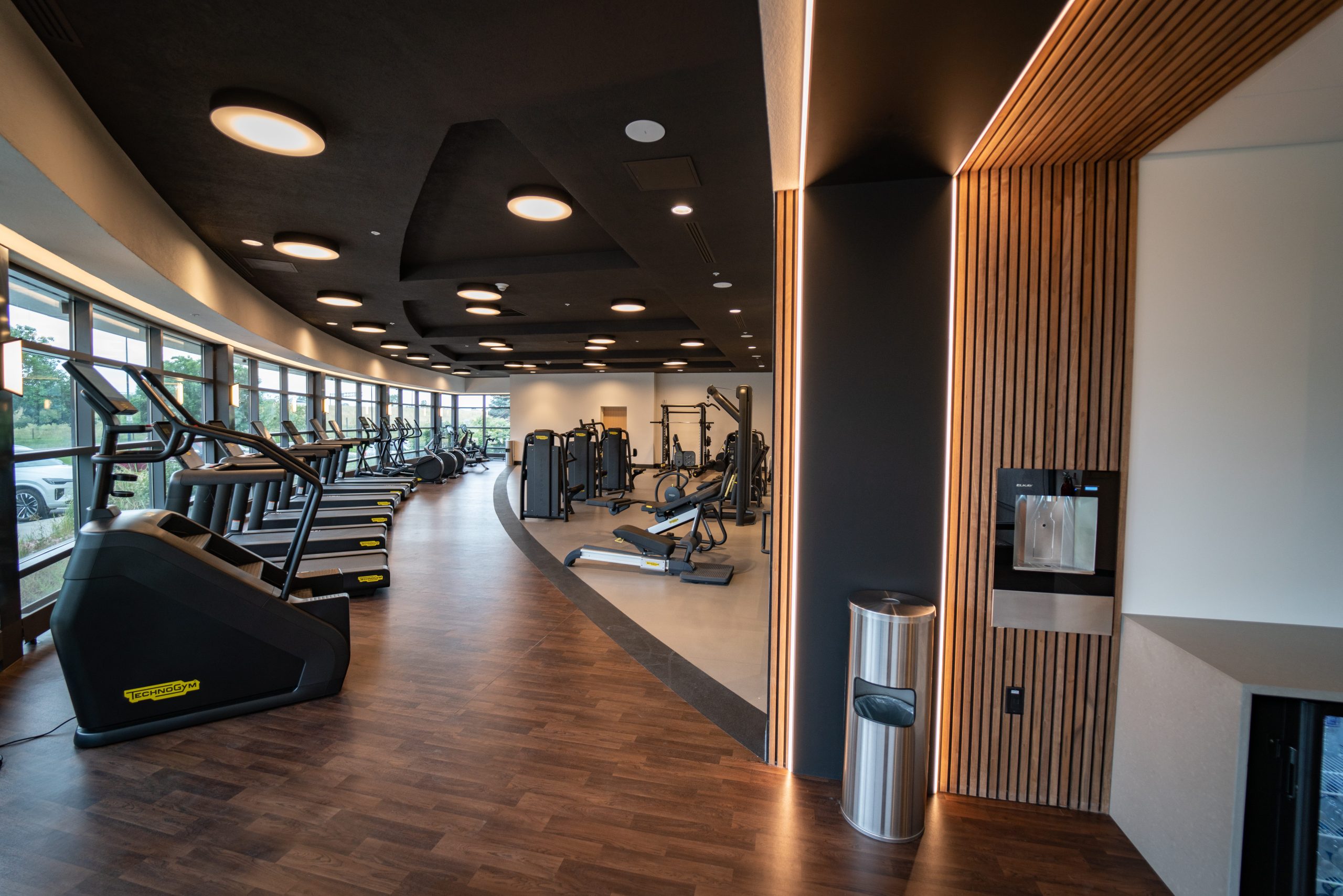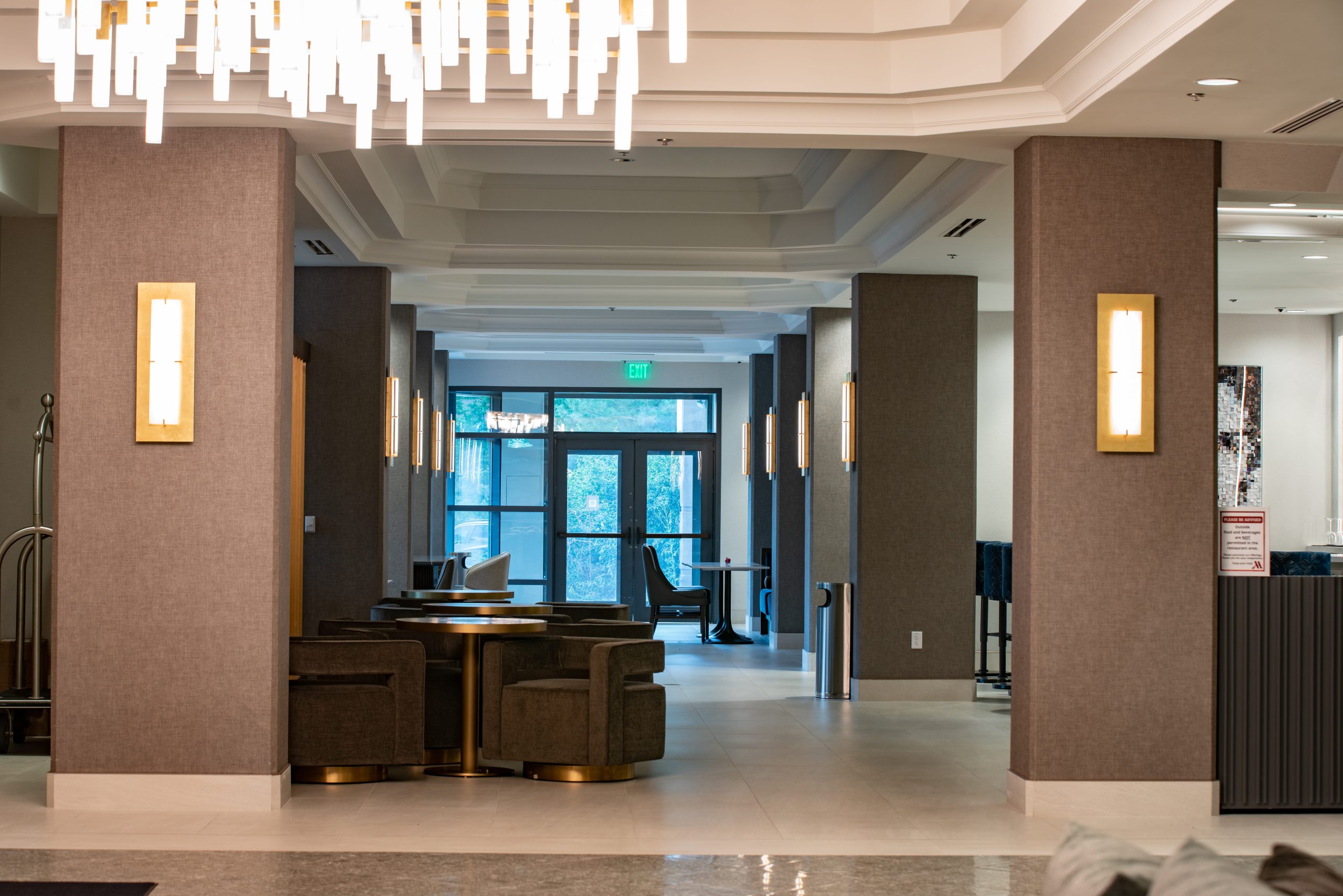 Key public spaces were reimagined to support flexible use throughout the day, including lounge seating that transitions from breakfast service to evening social hours. Signature features such as a two-story M Club lounge, a dimensional registration wall, and large window walls introduced natural light and visual openness, increasing both the functional and aesthetic demands placed on flooring transitions and detailing.